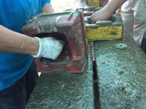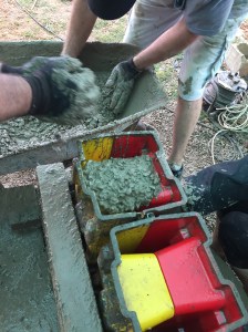 The first day our team of 13 made bricks that will be used in constructing houses for the toddlers. Once we removed the forms from bricks previously poured, the forms were oiled so that the hardened concrete would be easily removed. I was on the oiling team. Afterwards, the forms were reassembled and concrete poured into them. It takes two days for the concrete to set and harden.